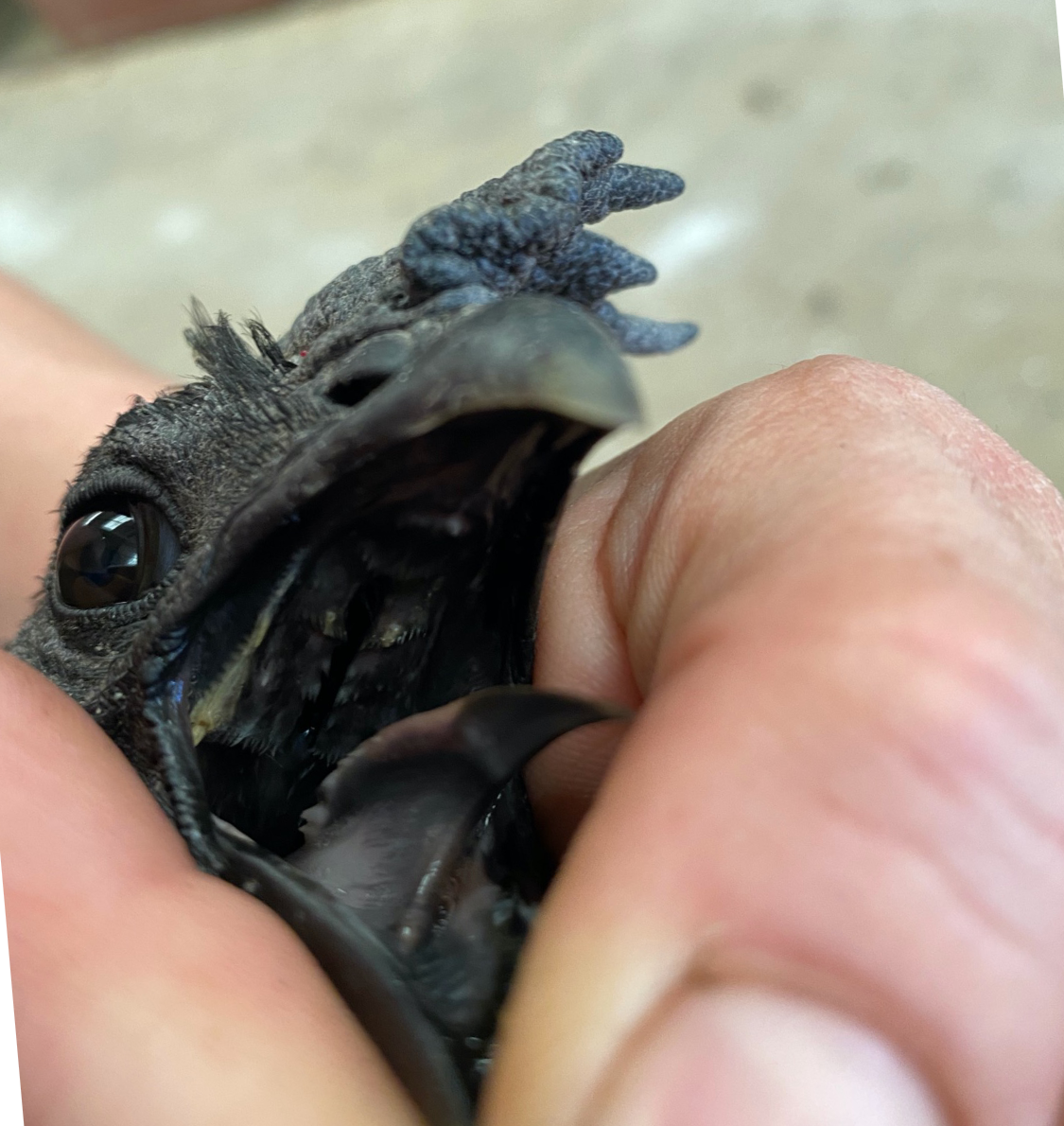 A caveat to Mulberry is hormonal flushing. A two copy rooster can display a hormonal flushing in the upper neck and lower waddles when experiencing their first higher rush of adult hormones typically around 6-8 months old. The coloration should fade back into a dark black after the hormones regulate. If they don’t go dark you may be looking at a single copy bird (cull). Hens do not display any type of hormonal flushing and should never be anything but black as they display the easiest.